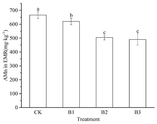 The available manganese (AMn) content in EMR decreased with increasing chili straw biochar levels, with the treated groups exhibiting significantly lower levels (reductions of 6.93% to 26.49%) compared to the control (p < 0.05, Figure 3). The highest and lowest AMn levels were observed in the CK (666.13 mg·kg−1) and B3 groups (489.68 mg·kg−1), respectively. Moreover, the AMn levels in the B2 and B3 groups differed only mildly from each other, but were significantly lower (reductions of 18.71% and 21.01%, respectively) compared to the levels in the B1 group.