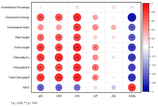 Pearson correlation analysis was performed between key chemical properties of EMR and growth or physiological parameters of alfalfa (Figure 4). Soil pH, OM content, and AN levels positively correlated (p < 0.01) with alfalfa GE, fresh weight, and chlorophyll content but negatively correlated (p < 0.05) with MDA content. Shoot height positively correlated with OM and AN levels (p < 0.01) and pH of EMR (p < 0.05). GI positively correlated with AN levels in EMR (p < 0.01). Furthermore, AP content in EMR positively correlated with alfalfa fresh weight, chlorophyll b, and total chlorophyll content. AMn content exhibited a significantly negative correlation with all alfalfa parameters (p < 0.01) except GR (no significant correlation), but was positively correlated with MDA content.