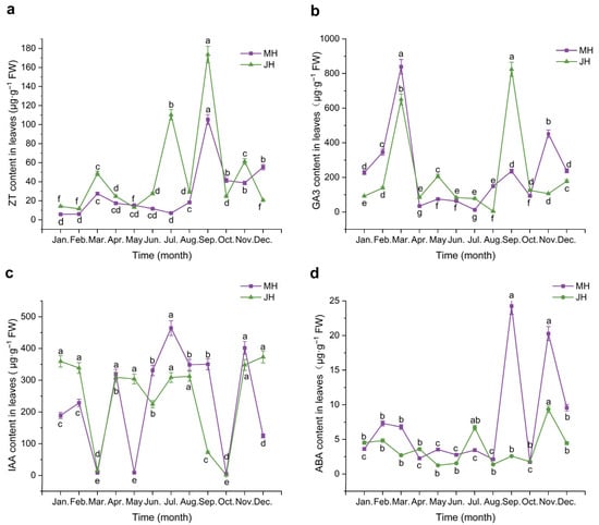 Dynamic changes in endogenous hormone contents in macadamia leaves at MH (purple line) and JH (green line) sites. (a) Zeatin (ZT); (b) Gibberellic acid (GA3); (c) Indole-3-acetic acid (IAA); (d) Abscisic acid (ABA). Error bars represent the standard error (n = 5). Different lowercase letters indicate significant differences (p < 0.05) among months within the same site based on one-way ANOVA followed by the LSD test.