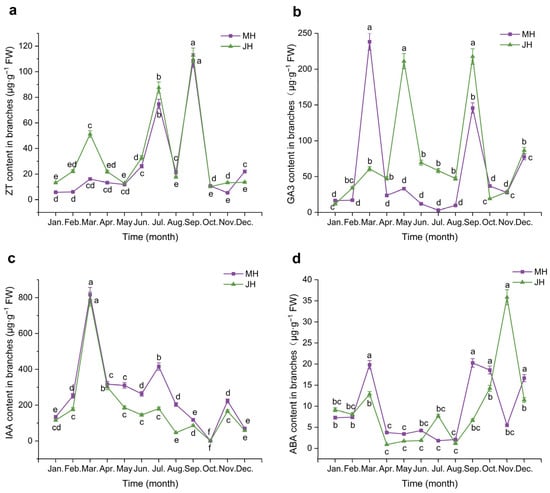 Dynamic changes in endogenous hormone contents in macadamia branches at MH (purple line) and JH (green line) sites. (a) Zeatin (ZT); (b) Gibberellic acid (GA3); (c) Indole-3-acetic acid (IAA); (d) Abscisic acid (ABA). Error bars represent the standard error (n = 5). Different lowercase letters indicate significant differences (p < 0.05) among months within the same site, as determined by one-way ANOVA followed by the LSD test.