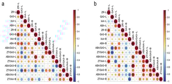 Correlation analysis of endogenous hormones and their ratios in macadamia at MH (a) and JH (b) sites. The size and color intensity of the circles indicate the strength of the correlation. Red circles represent positive correlations, and blue circles represent negative correlations. An asterisk (*) indicates statistically significant correlations (p < 0.05), two asterisks (**) indicate highly significant correlations (p < 0.01), and three asterisks (***) indicate very highly significant correlations (p < 0.001).