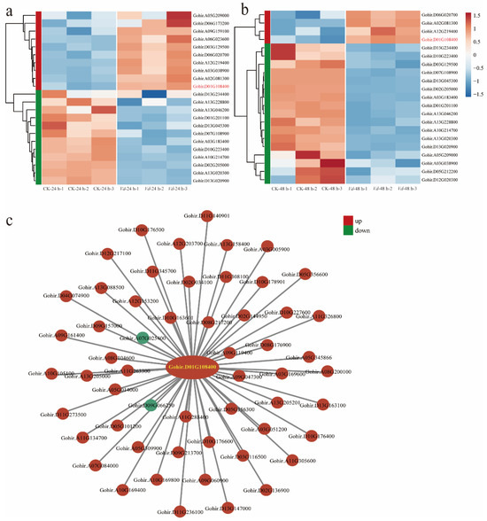 Analysis of differentially expressed genes in cotton before and after V. dahliae infection. (a) Expression analysis of ZFP genes 24 hpi. (b) Expression analysis of ZFP family genes 48 hpi. (c) WGCNA analysis of ZFP family genes.