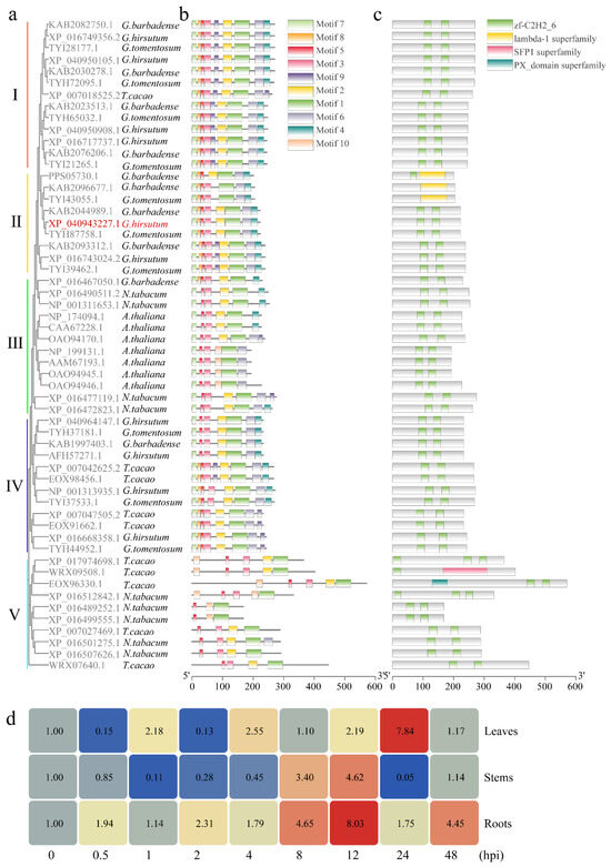 Bioinformatic and expression analysis of GhSTZ. (a) Maximum likelihood phylogenetic tree of GhSTZ orthologs (bootstrap = 1000). Gossypium hirsutum (G. hirsutum), Gossypium barbadense (G. barbadense), Gossypium tomentosum (G. tomentosum), Nicotiana tabacum (N. tabacum), Arabidopsis thaliana (A. thaliana), and Theobroma cacao (T. cacao). (b) Distribution of conserved motifs in GhSTZ orthologs. Colored boxes represent distinct motifs; zinc finger domains correspond to specific motifs. (c) Predicted conserved domains of GhSTZ orthologs highlighting C2H2 zinc finger domains. (d) Expression pattern analysis of GhSTZ in cotton plants following inoculation with VW. A heatmap analysis of GhSTZ gene expression across various organs (roots, stems, and leaves) of TM-1 cotton plants was conducted at multiple time points (0, 0.5, 1, 2, 4, 8, 12, 24, and 48 hpi) following inoculation with V. dahliae.