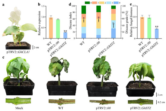 Functional validation of GhSTZ in VW defense. (a) Phenotype of cotton plants infiltrated with pTRV2::GhCLA1 at 14 dpi. (b) Relative GhSTZ expression levels in WT, pTRV2::00, and pTRV2::GhSTZ plants by RT-qPCR. (c) Representative images showing leaf wilting and vascular browning in WT, pTRV2::00, and pTRV2::GhSTZ plants at 20 dpi. (d) Disease indices of inoculated plants were calculated based on leaf symptom grading. (e) Relative fungal biomass quantification in stems at 20 dpi. Data are presented as the mean ± standard error (n = 3). Statistical significance is indicated as follows: ** p < 0.01. Different lowercase letters indicate statistically significant differences (p < 0.05).