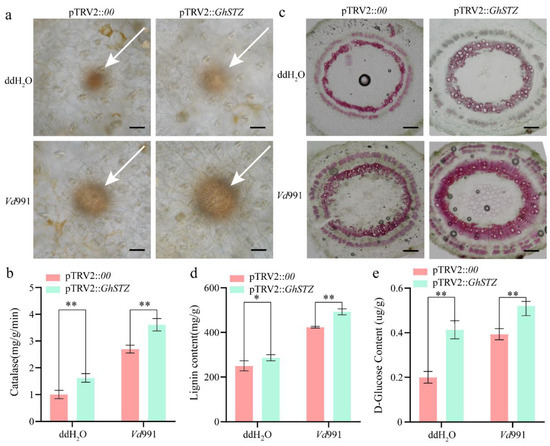 Physiological analysis of defense compound accumulation in GhSTZ-silenced plants. (a) Detection of ROS accumulation. DAB staining showing ROS accumulation (brown spots) in leaves of pTRV2::GhSTZ and pTRV2::00 plants under water-treated (Mock) and V. dahliae Vd991-inoculated conditions. Scale bar = 100 μm. The arrow indicates the site of ROS accumulation. (b) CAT enzyme activity. CAT activity in leaves of pTRV2::GhSTZ and pTRV2::00 plants under Mock and Vd991 inoculation treatments. (c) Vascular bundle structure visualization. Transverse sections of stems from pTRV2::GhSTZ and pTRV2::00 plants stained to reveal vascular bundle morphology. Scale bar = 100 μm. (d) Lignin deposition and quantification. Upper panel: phloroglucinol staining of stem sections showing lignin accumulation (red signal) in pTRV2::GhSTZ and pTRV2::00 plants. Scale bar = 100 μm. Lower panel: quantitative measurement of lignin content in stems. (e) Glucose content measurement. Glucose levels in leaves of pTRV2::GhSTZ and pTRV2::00 plants under Mock and Vd991 inoculation treatments. Data represent mean ± SD (n = 3). Statistical analysis was conducted using the t-test, with significance indicated as follows: * p < 0.05 and ** p < 0.01.