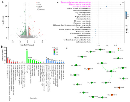 (a) Volcano plot of DEGs. Red dots represent significantly upregulated genes, green dots represent downregulated genes, and gray dots represent genes with no significant change in expression. (b) GO enrichment analysis of DEGs in pTRV2::00 vs. pTRV2::GhSTZ cotton plants. Significantly enriched terms are shown within the categories biological process (BP), cellular component (CC), and molecular function (MF). (c) KEGG pathway enrichment analysis of DEGs is shown, with the pathway highlighted in pink representing the one containing the most enriched genes. (d) PPI network analysis of DEGs. Nodes represent proteins encoded by DEGs; edges represent predicted interactions—red nodes: upregulated genes; green nodes: downregulated genes.