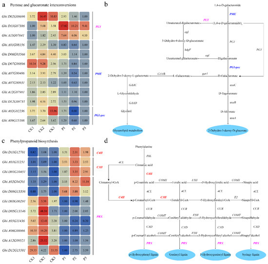 In the pentose and glucuronate interconversion pathway, PLY (Ghi_D02G08696) expression was significantly upregulated by 4.2-fold. In contrast, PLY (Ghi_D11G07386) and PLY (Ghi_A11G07641) expression decreased to 0.3-fold and 0.2-fold of the control levels, respectively. Furthermore, the expression of Ghi_A01G08156, Ghi_D06G03566, Ghi_A07G00931, Ghi_A12G07981, Ghi_A02G02236, and Ghi_A09G15106 was significantly upregulated, with increases ranging from 1.7- to 5.5-fold (Figure 7a).