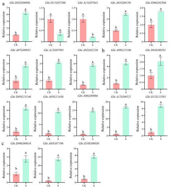 RT-qPCR validation of key defense-related gene expression in GhSTZ-silenced plants. (a) Expression levels of genes involved in the pentose and glucuronate interconversion pathway. (b) Expression levels of genes involved in the phenylpropanoid biosynthesis pathway. (c) Expression levels of genes involved in the plant–pathogen recognition pathway. pTRV2::00 plants served as the control (CK), while pTRV2::GhSTZ plants represented the silenced group (S). Data are presented as mean ± SD (n = 3 biological replicates). Different lowercase letters indicate statistically significant differences (p < 0.05).