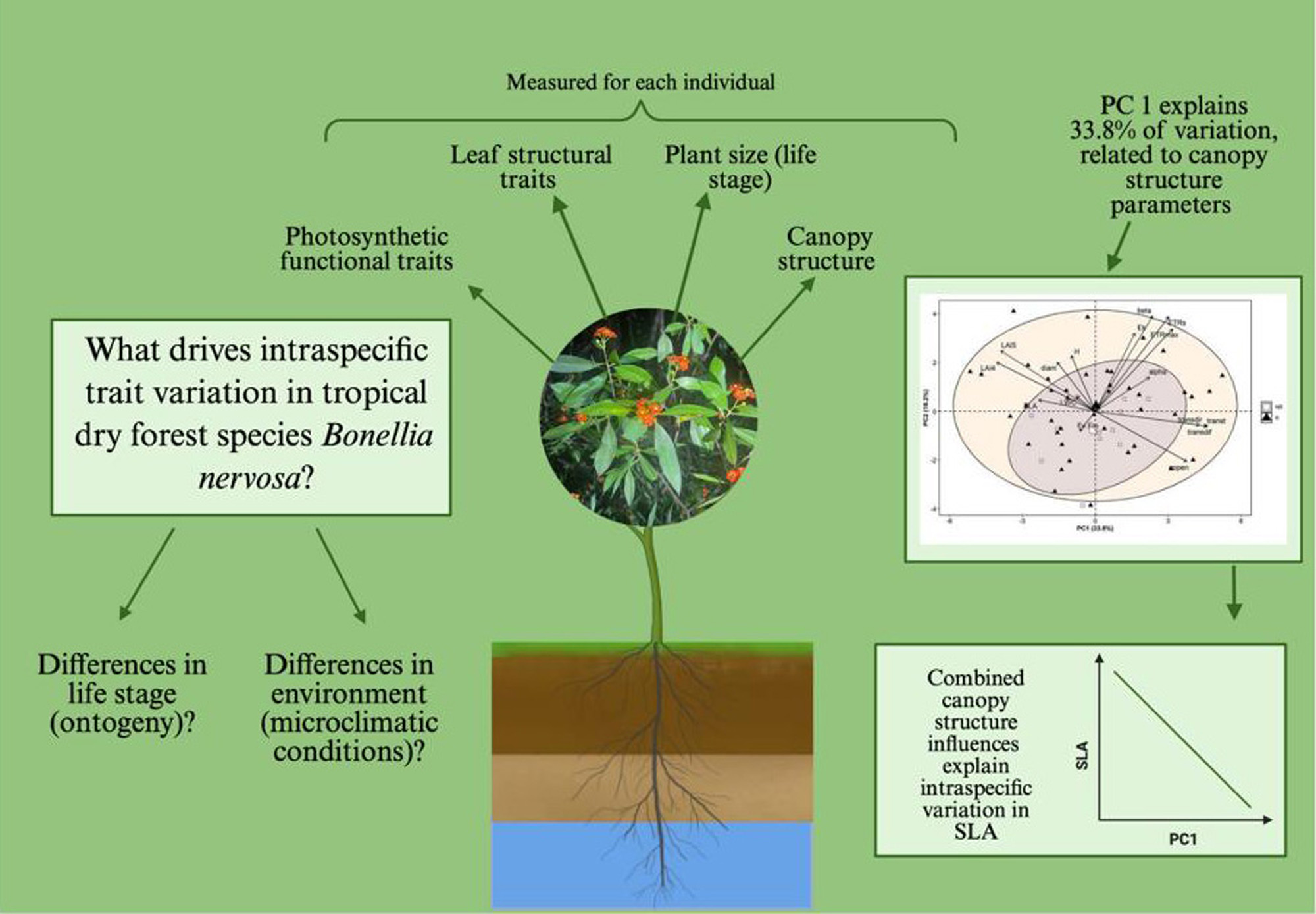- Trait variation will correlate with plant size and reproductive status: smaller, non-reproductive plants maximize light capture and growth by having thinner, larger leaves and a more acquisitive physiology (i.e., higher SLA, greater photosynthetic efficiency). As they grow larger and become reproductive, their strategy shifts toward a conservative and stress-tolerant strategy, developing traits that help them survive in a more variable and harsher environment (i.e., lower SLA, relatively lower photosynthetic efficiency), consistent with DRH.