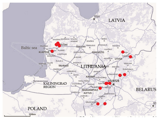 Figure 1. Map of studied fens (n = 15) in Lithuania (base map: https://www.geoportal.lt/map/ (accessed on 25 July 2025)).