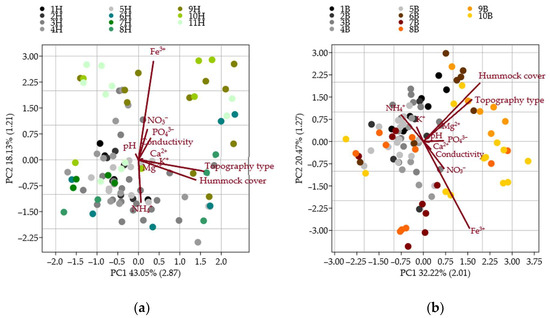 Figure 2. Principal component analysis (PCA) of environmental variables (hummock cover, topography type, pH, conductivity, and concentrations of Ca2+, Fe3+, K+, Mg2+, NH4+, NO3, and PO43−) influencing the distribution of vascular plant (1H–11H) (a) and bryophyte (1B–10B) (b) groups; each colour represents a different group based on components (PC) with eigenvalues greater than one (eigenvalues shown in parentheses on axes).