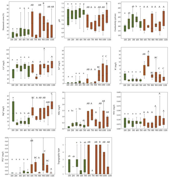 Figure 3. Comparison of ecological variables (hummock cover; pH; conductivity; concentrations of Ca2+, Fe3+, K+, Mg2+, NH4+, NO3, and PO43−; and topography types) among vascular plant groups (1H–11H) using boxplots, showing significant differences in environmental conditions. Colours represent different clusters assigned to each group. Lowercase letters indicate statistically significant differences among groups within cluster IH, while uppercase letters indicate differences among groups within cluster IIH. Statistical differences were tested using the Kruskal–Wallis test followed by Dunn’s post hoc test (p < 0.05).