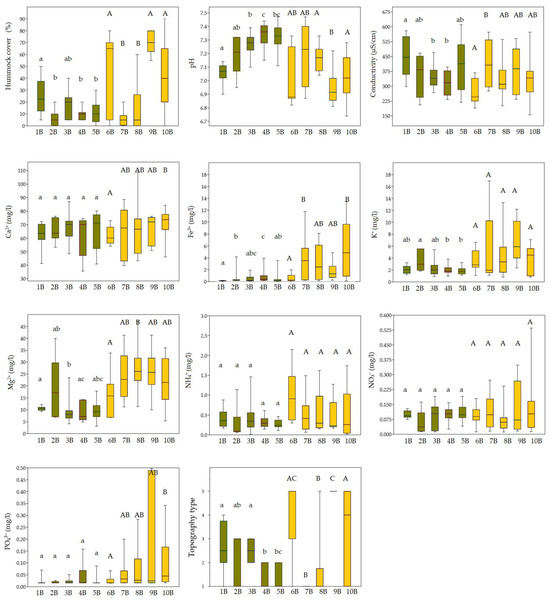 Figure 4. Comparison of ecological variables (hummock cover; pH; conductivity; concentrations of Ca2+, Fe3+, K+, Mg2+, NH4+, NO3, and PO43−; and topography type) among bryophyte groups (1B–10B) using boxplots, showing significant differences in environmental conditions. Colours represent different clusters assigned to each group. Lowercase letters indicate statistically significant differences among groups within cluster IB, while uppercase letters indicate differences among groups within cluster IIB. Statistical differences were tested using the Kruskal–Wallis test followed by Dunn’s post hoc test (p < 0.05).