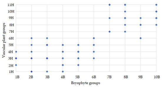 The joint distribution of bryophyte and vascular plant groups highlights apparent asymmetries in the ecological amplitude and habitat specificity of vascular plant groups of different clusters. Bryophyte groups 1B–5B were closely related to vascular plant groups of the IH cluster, while 7B–10B bryophyte groups were with the vascular groups from the IIH cluster (Figure 5).