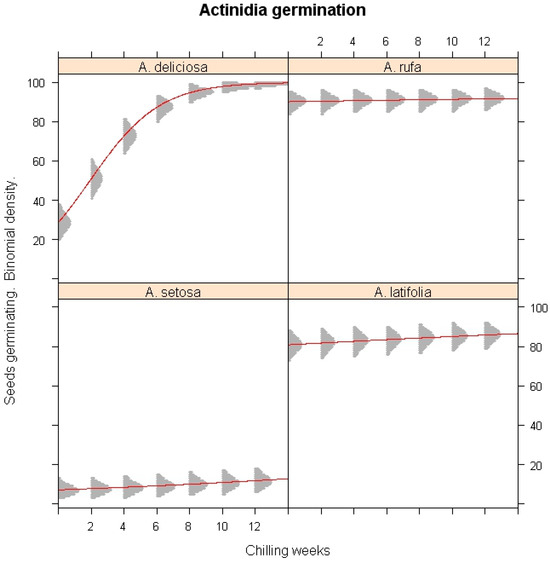 Figure 1. Simulations of the impact of winter chilling duration on the seed germination of A. deliciosa, A. rufa, A. setosa, and A. latifolia under different chilling weeks. The x-axis represents continuous stratification duration; the y-axis shows predicted germination probability. The red lines represent the logistic regression lines, and the gray shaded areas are binomial confidence intervals from the logistic regression model.