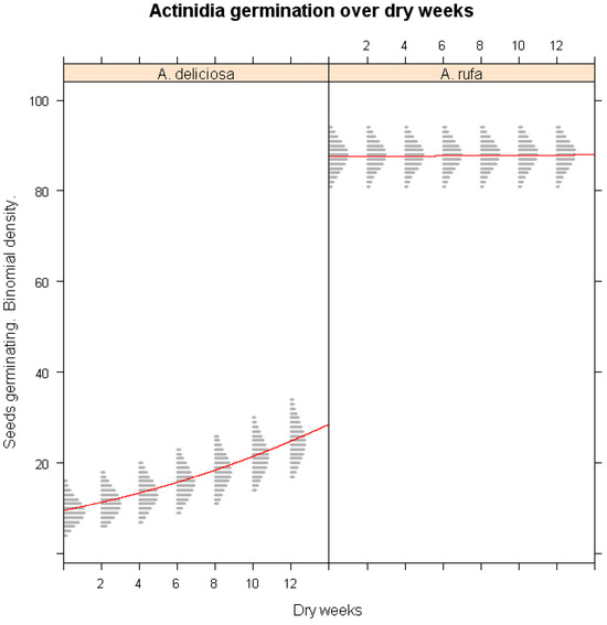 Figure 6. Predicted seed germination probability of Actinidia deliciosa and A. rufa under severe warm winter conditions following different drought durations. The x-axis represents continuous drought duration; the y-axis shows predicted germination probability. The red lines represent the logistic regression lines, and the gray shaded areas are binomial confidence intervals from the logistic regression model.