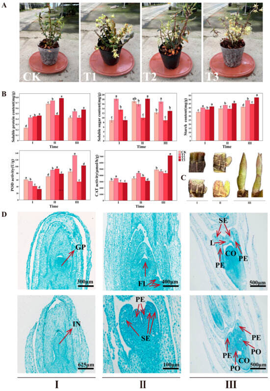 Phenotypic and physiological changes under different treatments. (A) Phenotypes of D. officinale under treatments. (B) Measurements of physiological parameters. (C) Morphology of D. officinale flower buds at different stages. (D) Cellular structures observed under optical microscopy. Note: (A) Different lowercase letters indicate significant differences (p < 0.05) between different treatment groups, and the error bars represent the standard deviation. (D) GP—growth cone; IN—inflorescence primordium; FL—flower bud primordium; SE—sepal primordium; PE—petal primordium; CO—column primordium; L—Lip; and PO—pollinium.