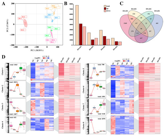 (A) Principal component analysis (PCA). (B) The number of upregulation and downregulation of differential genes. (C) Venn graph under hormone treatment. (D) Differential gene clustering analysis. Note: (D) In the box plot, pink, blue, orange, green and purple respectively represent Group D1, D2, D3, D4 and D5.
