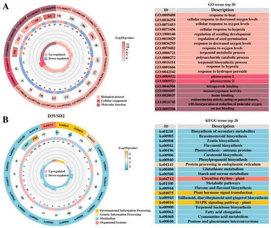 We performed GO and KEGG enrichment analyses for DEGs from D3 vs. D2, D2 vs. D1, D4 vs. D2, and D5 vs. D4 comparisons. The gene ontology (GO) framework comprises three domains: biological process (BP), cellular component (CC), and molecular function (MF). The GO enrichment results showed that the 935, 4514, 1245, and 525 genes were annotated as BP, CC, and MF, respectively. For all the upregulated and downregulated genes in the comparisons of D2 with D1, D4 with D2, and D5 with D4, the top ten annotated GO terms were all cellular anatomical entity (GO: 0110165), cellular process (GO: 0009987), binding (GO: 0005488), metabolic process (GO: 008152), catalytic activity (GO: 0003824), response to stimulus (GO: 0050896), biological regulation (GO: 0065007), regulation of biological process (GO: 0050789), developmental process (GO: 0032502), and multicellular organismal process (GO: 0032501). In the top ten GO terms of D2 vs. D1, D4 vs. D2, and D5 vs. D4, 3679, 2700, 2551, 2349, 2069, 1374, 1235, 1137, 841, and 694 were annotated as upregulated genes, and 2907, 2175, 2175, 1891, 1654, 1288, 1024, 947, 580, and 523 were annotated as downregulated genes (Figure S1). The GO enrichment analysis of the D3 vs. D2 comparison revealed that the DEGs identified after hormone treatment were mainly enriched in the following GO terms: in the biological process category—response to heat, cellular response to decreased oxygen levels, cellular response to oxygen levels, cellular response to hypoxia, regulation of seedling development, regulation of seed germination, etc.; in the cell composition category—photosystem I and photosystem II; in the cell organization category—tetrapyrrole binding, monooxygenase activity, heme binding, oxidoreductase activity, acting on paired donors, with incorporation or reduction of molecular oxygen, and iron ion binding (Figure 3A).