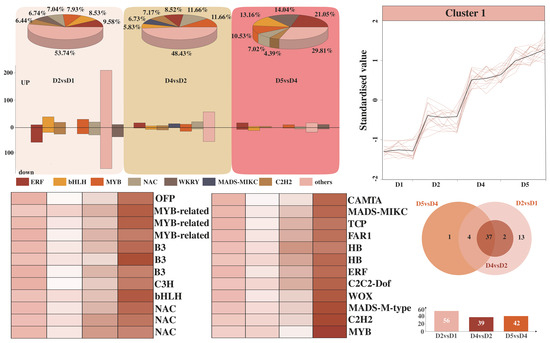 Proportion and number of transcription factors in D2 vs. D1, D4 vs. D2, and D5 vs. D4 (A). Transcription factors with continuously increasing expression levels (B) and expression analysis (C). Venn diagram of transcription factors (D).