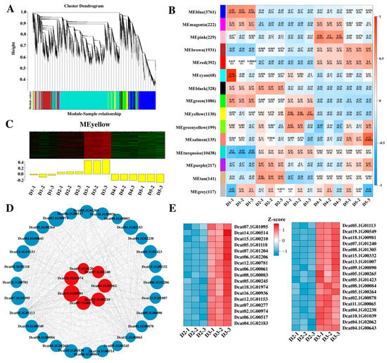 WGCNA analysis of genes related to flower bud differentiation in D. officinale (A–C). The yellow module shows the gene-related network connected to the C2H2 (Dcat18.1G00981) gene with an edge weight of >0.40 (D), and the expression analysis of these genes (E). Note: (A) Each color in the figure represents that all the genes corresponding to each color on the clustering tree belong to the same module. (B) Each number in the grid represents the correlation between the module and the sample. The closer the value is to 1, the stronger the positive correlation between the module and the sample. The number in parentheses represents the significance p-value. The smaller the value, the stronger the significance. (D) The larger the edge weight, the darker the color of the line connecting the two points. The higher the connectivity, the larger the node. Red represents transcription factors.