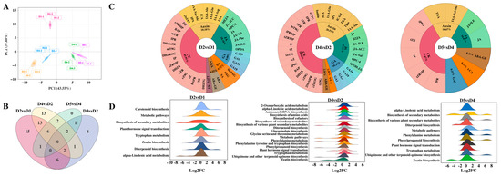 We profiled hormone metabolomes across five bud differentiation stages (D1–D5) under natural and treated conditions. PCA revealed clear inter-stage separation, confirming data reliability (Figure 6A). Venn diagrams illustrate comparative relationships. We identified six shared metabolites in D2 vs. D1, D4 vs. D2, and D5 vs. D4, and six unique metabolites in D3 vs. D2. All of these were related to cytokinins (CK) and gibberellins (GA) (Figure 6B). Subsequently, we performed Krona analysis on the identified DAMs to illustrate the distribution of metabolite classes. The results showed that 44, 39, and 12 DAMs were identified in the comparisons of D2 vs. D1, D4 vs. D2, and D5 vs. D4, respectively. Among them, CK accounted for the largest proportion—45.91%, 56.42%, and 41.67%—followed by auxins (Auxin) and jasmonic acid (JA). Notably, no strigolactone (SL) was detected in the later stages of bud differentiation or flower development, suggesting that SL may act only in the early and middle stages (Figure 6C). KEGG enrichment analysis showed that the DAMs were significantly associated with hormone biosynthesis pathways (zeatin, carotenoid, α-linolenic acid, tryptophan, and diterpenoid biosynthesis), confirming tight hormonal regulation of differentiation (Figure 6D).