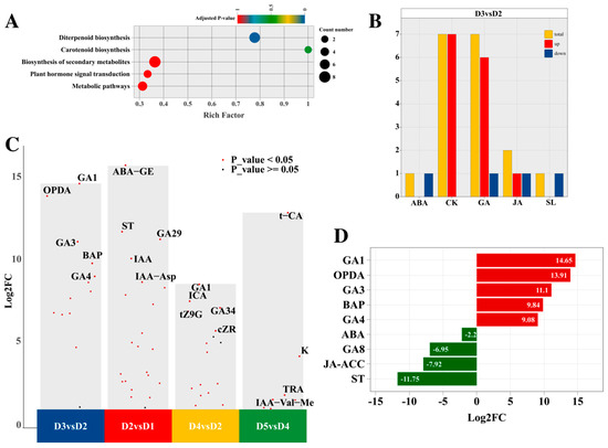 KEGG analysis (A), endogenous hormone quantity (B), differential results of the different groups (C), and the differential ratios of the DAMs (D) in the D3 versus D2 comparison group. Note: (D) Red color indicates that log2FC > 0, while green color represents that log2FC < 0.