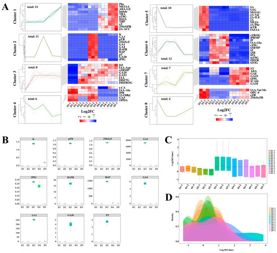Performing cluster analysis of the DAMs across the five stages using heat maps of expression patterns revealed eight distinct clusters (Figure 8A). Among them, the metabolites in Cluster 5 were specifically upregulated in stage D3, suggesting that these compounds play a key role in initiating flower bud differentiation. Metabolites in Cluster 6 increased significantly in D2, and their expression pattern closely resembled that of stage D3 after hormone treatment. This suggests that these compounds might not be directly involved in the hormone-mediated promotion of differentiation. Further analysis revealed that this cluster was mainly composed of cytokinins, with their expression peaking only in the mid-stage of differentiation. This indicates that CKs might specifically regulate this developmental stage. In contrast, the metabolites in Cluster 7 were consistently highly expressed from the late stage of bud differentiation through flower development, with gibberellins being the most abundant. This suggests that GA may dominate developmental regulation during this period. Interestingly, 11 DAMs were identified in Cluster 3 throughout the flower bud differentiation cycle, and these metabolites showed specific high expression patterns after hormone treatment. Besides the aforementioned Gibberellins (GA1, GA3, and GA4) and 6-Benzyladenine (BAP), this cluster also enriched various cytokinin substances, including Kinetin (K), N6-Isopentenyl-adenine-9-glucoside (iP9G), and para-Topolin riboside (pTR). Compared with other stages, these metabolites’ expression levels were significantly altered after hormone treatment (Figure 8B), suggesting an important role in hormone-mediated regulation of flower bud differentiation. Further quality control analysis revealed that the expression distribution (box plot) and density curve of these DAMs were highly consistent (Figure 8C,D), not only verifying the reproducibility of the experimental data but also confirming the reliability of the conclusions. This discovery provides new metabolomic insights into the molecular mechanism of exogenous hormone regulation of flower bud differentiation.