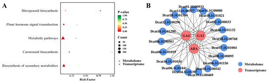 Integrated analysis of transcriptomic and metabolomic data revealed a convergence: many DEGs and DAMs were significantly enriched in the plant hormone signal transduction pathway (Figure 9A). This robust enrichment underscores the pivotal role of this pathway in orchestrating the hormone-promoted flower bud differentiation process in D. officinale.
