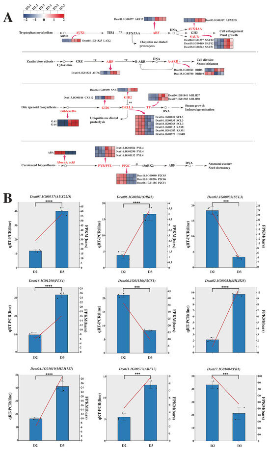 The above findings reveal a direct molecular connection between the gene expression changes (identified by transcriptomics) and metabolic alterations (detected by metabolomics) triggered by the combined hormone treatment. To delve deeper into the specific responses of these interconnected hormone pathways to the exogenous 6-BA and GA3 treatment, we analyzed the expression patterns of key pathway components. In this study, we identified 25 DEGs in the comparisons of D3 vs. D2. These DEGs were mainly concentrated in the auxin, cytokinin, gibberellin, and abscisic acid pathways. Among the 25 DEGs involved in these pathways, one AUX1 (Dcat18.1G01825), one AUX/IAA (Dcat03.1G00317), one ARF (Dcat11.1G00577), and three SUARs (Dcat19.1G00469, Dcat18.1G00542, and Dcat04.1G01397) were involved in the auxin signaling pathway, and all of these genes were upregulated after hormone treatment; one AHP (Dcat10.1G01821) and two A-ARRs (Dcat06.1G00561 and Dcat18.1G00780) were differentially expressed in the comparison of D3 vs. D2 in the cytokinin pathway; one GID1 (Dcat15.1G00544), one GID2 (Dcat03.1G00190), six DELLA (Dcat18.1G00768, Dcat01.1G00933, Dcat16.1G00928, Dcat16.1G00578, Dcat06.1G01387, and Dcat15.1G00715), and two TFs (Dcat04.1G01019 and Dcat06.1G01841) were upregulated in the gibberellin pathway; and three PYR/PYL (Dcat16.1G01290, Dcat16.1G01132, and Dcat18.1G01584) were upregulated and three PP2Cs (Dcat16.1G00080, Dcat12.1G00296, and Dcat06.1G01156) were downregulated in the comparison of D3 vs. D2 in the abscisic acid pathway. Additionally, GA1 and GA4 in the gibberellin pathway were upregulated after hormone treatment, while ABA in the abscisic acid pathway was downregulated (Figure 10A).