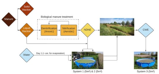 A schematic overview of the manure treatment process and the streams composing the growing medium of the systems is presented in Figure 1. At the pig farm, the manure treatment process starts with the separation of manure into a solid and a liquid fraction (resp. SF, LF) using a centrifuge. The SF typically contains more P, and the LF is richer in N. After centrifugal separation, the LF is further treated biologically, with nitrification–denitrification (NDN), during which ammonia is converted into nitrogen gas (N2). Eventually, an NDN effluent (NDNE) is obtained. In order to further reduce the nutrient content in the NDNE, the effluent is treated in a constructed wetland (CW) until a dischargeable effluent is obtained, which we refer to constructed wetland effluent (CWE) [].
