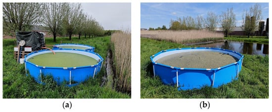 Picture of (a) S1 and S2 filled with a mixture of water, nitrification–denitrification effluent (NDNE), and liquid fraction of pig manure (LF), in which duckweed is growing. The black plastic-covered IBC containers storing the fertilizer mix (10% LF and 90% NDNE) can be seen next to them; (b) Picture of S3, filled with effluent from the wetland in which duckweed is growing.