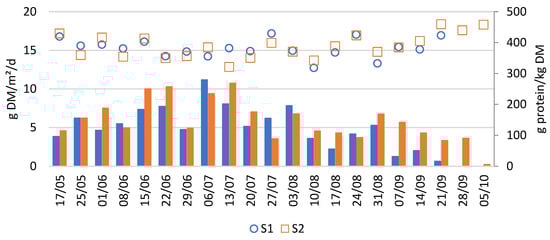 Figure 3 reports the biomass (dry matter) and protein production of these systems over the growing season. The average weekly biomass productivity of both S1 and S2 was 5.5 ± 2.6 g DM/m2/day. This yield is consistent with previous research in Flanders using similar nutrient sources, which reported an average biomass productivity of 6.1 ± 2.5 g DM/m2/day [].
