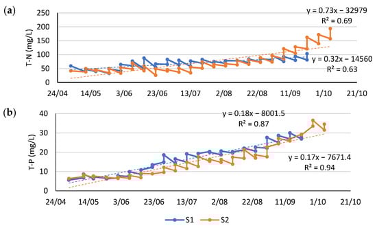 Despite the high variability, nutrient removal rates observed in S1 and S2 were generally consistent with those reported in previous studies. For nitrogen (N), an average removal rate of 1.2 g/m2/day was recorded, closely aligning with previous findings by Devlamynck et al., who reported N removal rates of 1.1 g/m2/day under similar wastewater conditions and weather patterns [,]. The nitrogen removal attributable to harvest in this study also fell within the range of N uptake previously observed (327 ± 107 and 264 ± 123 mg N/m2/day) [,]. The proportion of total nitrogen removed through harvesting was higher in this study (48 ± 74%) compared to the previous research (27% and 24% [,]).