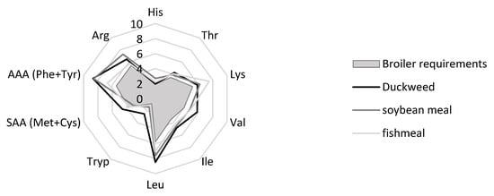 Representation of the essential amino acid composition of a duckweed protein (from ‘Mix 4’ sample as represented in Table A1) as a percentage of the total protein. For comparison, the human requirements and the EAAs% of two alternative protein sources for humans (soybean meal and whole egg) are represented [,,].