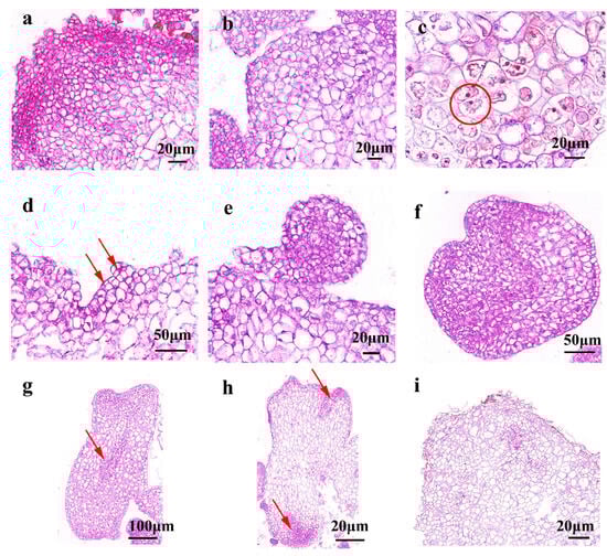 To confirm the embryogenic identity and developmental origin of these structures, histological analysis was conducted (Figure 2). Early-stage embryogenic cells originated from single epidermal or subepidermal cells and exhibited dense cytoplasm, thickened cell walls, and prominent nuclei (Figure 2a,b). These cells underwent anticlinal division to form paired pro-embryogenic cells (Figure 2c, red circle), followed by symmetric divisions to generate 4–8 cell clusters typical of early pro-embryo formation (Figure 2d, red arrows). These clusters advanced through the globular (Figure 2e), heart-shaped (Figure 2f), and torpedo-shaped stages (Figure 2g, red arrow), with initial vascular differentiation observed at the torpedo stage. At the cotyledonary stage, embryos displayed well-defined cotyledons, shoot and root apical meristems, and hypocotyls (Figure 2h, red arrows). In contrast, non-embryogenic calli showed large vacuolated cells with disorganized structure and lacked meristematic zones (Figure 2i).