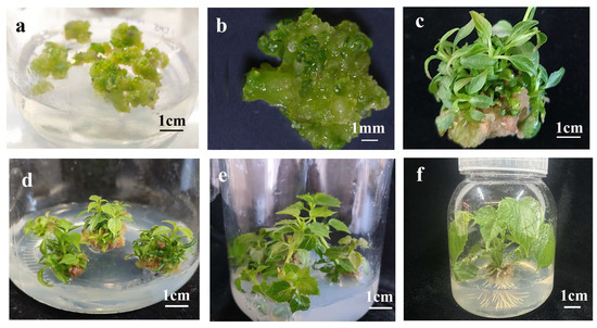 Morphological progression of indirect shoot organogenesis from embryogenic callus of C. bungei (genotype 12–13). (a) Adventitious bud protrusions emerging from embryogenic callus after 30 days of culture on shoot organogenesis medium (SOM) (scale bar = 1 cm). (b) Higher-magnification view of adventitious bud initiation (scale bar = 1 mm). (c,d) Clusters of adventitious shoots with well-formed leaves and petioles developed from the callus (scale bars = 1 cm for both). (e) Elongated adventitious shoot after individual subculture on fresh SOM (scale bar = 1 cm). (f) Adventitious shoot successfully rooted within 20 days after transfer to rooting medium (scale bar = 1 cm).