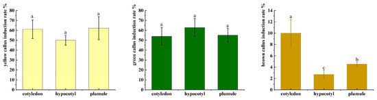 The effect of different explants (cotyledons, hypocotyls, and plumules) derived from mature zygotic embryos on the induction rate of green callus in C. bungei (genotype 12–13). Different letters in each bar show significant differences by Duncan’s multiple range tests (p ≤ 0.05).