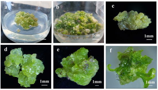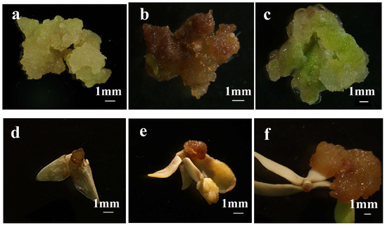 Morphological characteristics of different callus types induced from mature zygotic embryos of C. bungei (genotype 12–13) on callus induction medium (CIM, MS-based). Calli were cultured for 20 days under controlled conditions (25 ± 2 °C, 16 h light/8 h dark photoperiod, light intensity 40 μmol·m−2·s−1), with 3 biological replicates per treatment. (a) Yellow callus, (b) brown callus, and (c) green callus induced on CIM with 6-BA and NAA. (d–f) Brown calli formed on CIM containing 2,4-D, exhibiting necrosis during prolonged subculture. All scale bars = 1 mm.