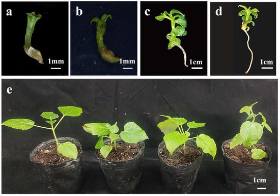 Regeneration of whole plants from cotyledonary somatic embryos of Catalpa bungei (genotype 12–13). When the cotyledons turned green, the somatic embryos were transferred to hormone-free 1/2 MS medium. (a,b) Cotyledonary somatic embryos initiating greening and cotyledon expansion, with radicle elongation (scale bar = 1 mm). (c) Development of multiple true leaves from the embryo axis (scale bar = 1 cm). (d) Complete plantlet with well-developed shoots and elongated root system (scale bar = 1 mm). After 30–40 days of culture, the embryonic roots elongated to 5–7 cm, and the plantlets were transplanted into nutrient pots containing peat soil, as shown by (e) successfully acclimatized plantlets after transplantation (scale bar = 1 cm).