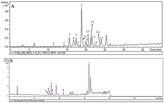 Base peak chromatogram (A) (negative mode), (B) positive mode of the extract from Fridericia platyphylla leaves. The peak numbers in this figure correspond to those used in Table 1.