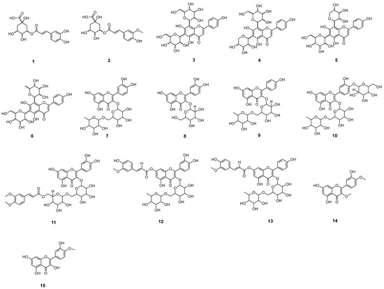 Another class that attracts the attention of researchers due to its wide range of beneficial effects on human health and low toxicity is the flavonoids. In addition to the main subgroup of flavonoids, their glycosides also receive increasing attention. These compounds possess similar stability and bioactivity but usually have improved solubility, reduced biological toxicities, and are often more efficacious than their non-glycoside forms in pharmacological studies. Tests performed on RAW 264.7 murine macrophage cells showed that flavonoid glycosides exhibited more significant anti-inflammatory activities compared to their related aglycones [48].