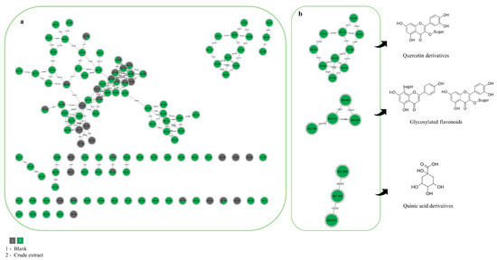 (a) Complete molecular network obtained; (b) focus on molecular families obtained from classical molecular networking and annotated based on spectral matches within the GNPS platform. Each node represents a cluster of tandem mass spectrometry spectra (MS/MS), while the edges that connect them represent the MS/MS fragmentation similarity (cosine > 0.7).
