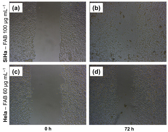 Cells (1 × 105 cells/well) were plated in DMEM with FBS 10% in 96-well plates and incubated (atmosphere of 5% CO2 and 95% humidity, at 37 °C) for 24 h. After confirming the formation of a complete monolayer, the cells were wounded by scratching lines with a standard 10 μL plastic tip. Then, the culture medium was removed, the wells were washed with PBS buffer (to remove debris), and 180 µL of culture medium was added. Then, the plate was covered and sealed on the sides with parafilm, and each well was photographed using an inverted microscope (Opticam O500i) equipped with a camera (NA 0.30, WD 72) and a 10× objective. Afterward, the plate was returned to the laminar flow, and 20 µL of FAB (10× concentrated) was added to the wells, to obtain final concentrations of 20, 40, 60, and 100 µg mL−1, or 20 µL of cisplatin (CPT) (10× concentrated) to obtain concentration of 5 µg mL−1, or it was placed the culture medium (control), and the plate was incubated again. These photographic records correspond to time zero (T0). After 24 h, 48 h, and 72 h of treatment, the wells were photographed again (TF) to determine the migration and cell movement throughout the wound area. Each experiment was performed in triplicate.
