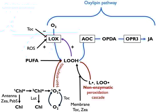 - Demmig-Adams, B.; Cohu, C.M.; Amiard, V.; Van Zadelhoff, G.; Veldink, G.A.; Muller, O.; Adams, W.W., III. Emerging Trade—offs—Impact of Photoprotectants (PsbS, Xanthophylls, and Vitamin E) on Oxylipins as Regulators of Development and Defense. New Phytol. 2013, 197, 720–729. [Google Scholar] [CrossRef]
