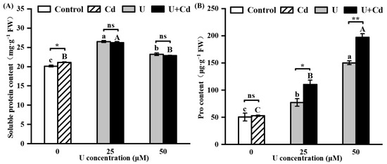 2.4. U and Cd Interfere with Soluble Protein and Pro Accumulation in Radish Roots
