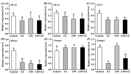 2.5. Relative Expression Level of Genes Involved in U and Cd Transportation
