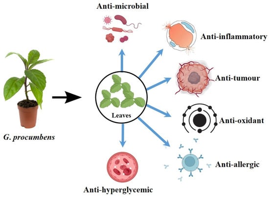 Gynura procumbens, commonly known as longevity Spinach, is a fast-growing herbaceous plant valued for its rich medicinal properties and health-promoting compounds. Despite its wide range of reported pharmacological benefits, it remains underutilized. G. procumbens, indigenous to Southeast Asia, has been traditionally utilized for centuries as a functional food and herbal remedy. The leaves, in particular, are used in various culinary forms: in Thailand, they are cooked as vegetables, whereas in Malaysia, they are often eaten raw in salads, sometimes served with rice [6,7]. Historically, G. procumbens has been used to treat a broad range of health conditions, including fever, migraines, skin rashes, and infections accompanied by inflammation, alongside non-communicable diseases, such as hypertension, kidney disorders, high cholesterol, and cancer [8]. This plant exhibits significant therapeutic properties, including antimicrobial, antioxidant, anti-inflammatory, antihyperglycemic, antiallergic, and antitumorigenic activities (Figure 1 and Table 1). These effects are attributed to various bioactive compounds found in G. procumbens, such as flavonoids, terpenoids, and saponins [9]. Among these, flavonoids and other phenolic compounds are believed to play a central role in the medicinal efficacy of the plant [10,11].