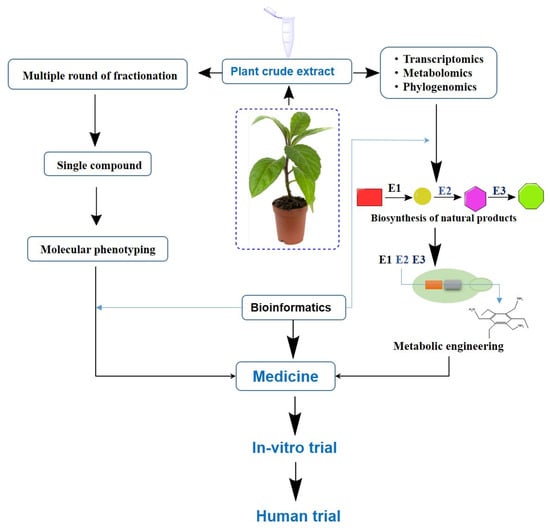 Schematic workflow of plant-derived drug discovery and development. The process begins with crude extracts derived from medicinal plants (e.g., G. procumbens), followed by multi-step fractionation, and molecular phenotyping. Concurrently, omics technologies (transcriptomics, metabolomics, and phylogenomics) elucidate biosynthetic pathways of natural products. Enzyme clusters (E1–E3) involved in metabolite biosynthesis are engineered through metabolic engineering to enhance compound production. Identified compounds are further developed into medicines, progressing through in-vitro trials and ultimately human clinical trials.