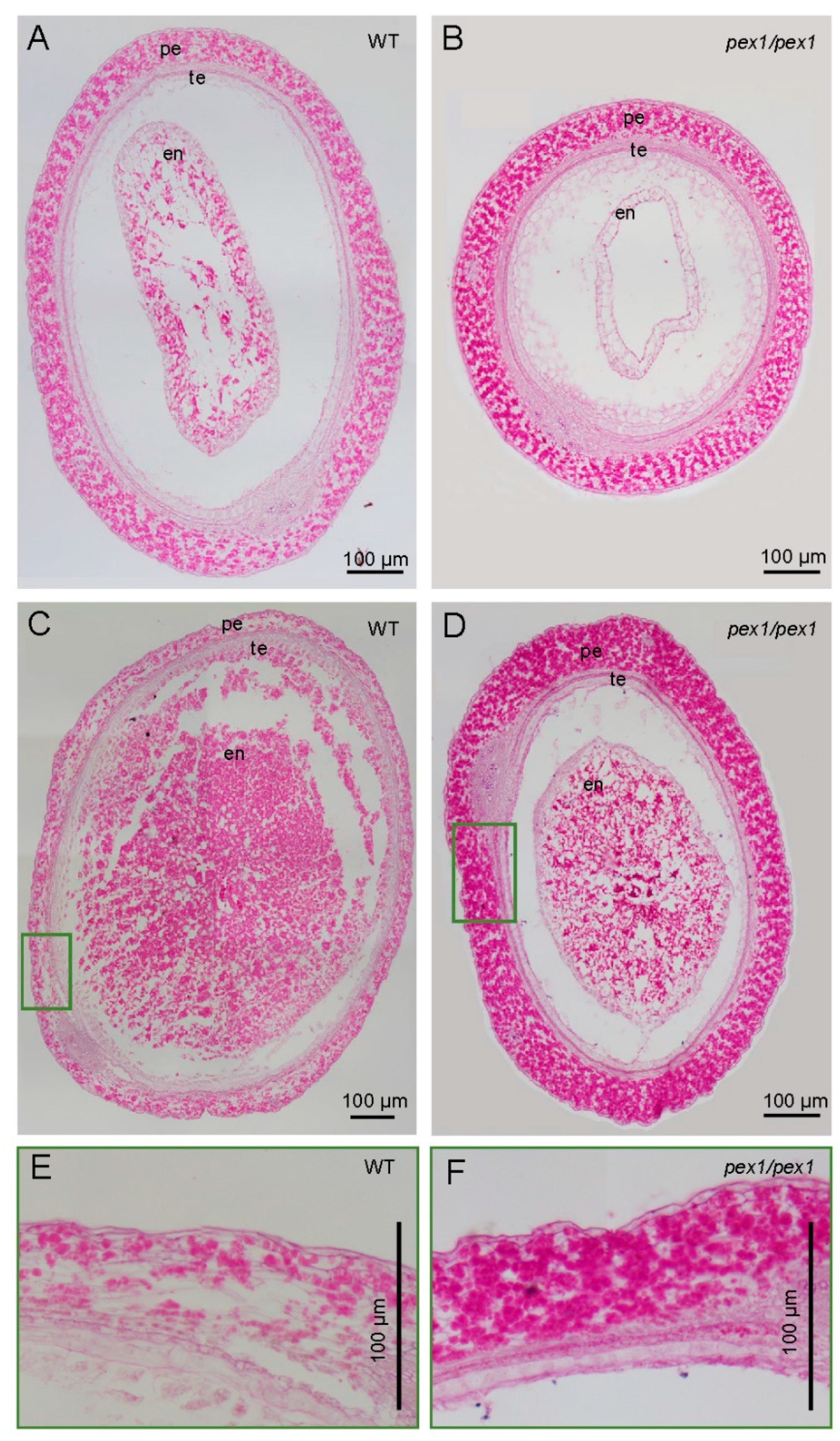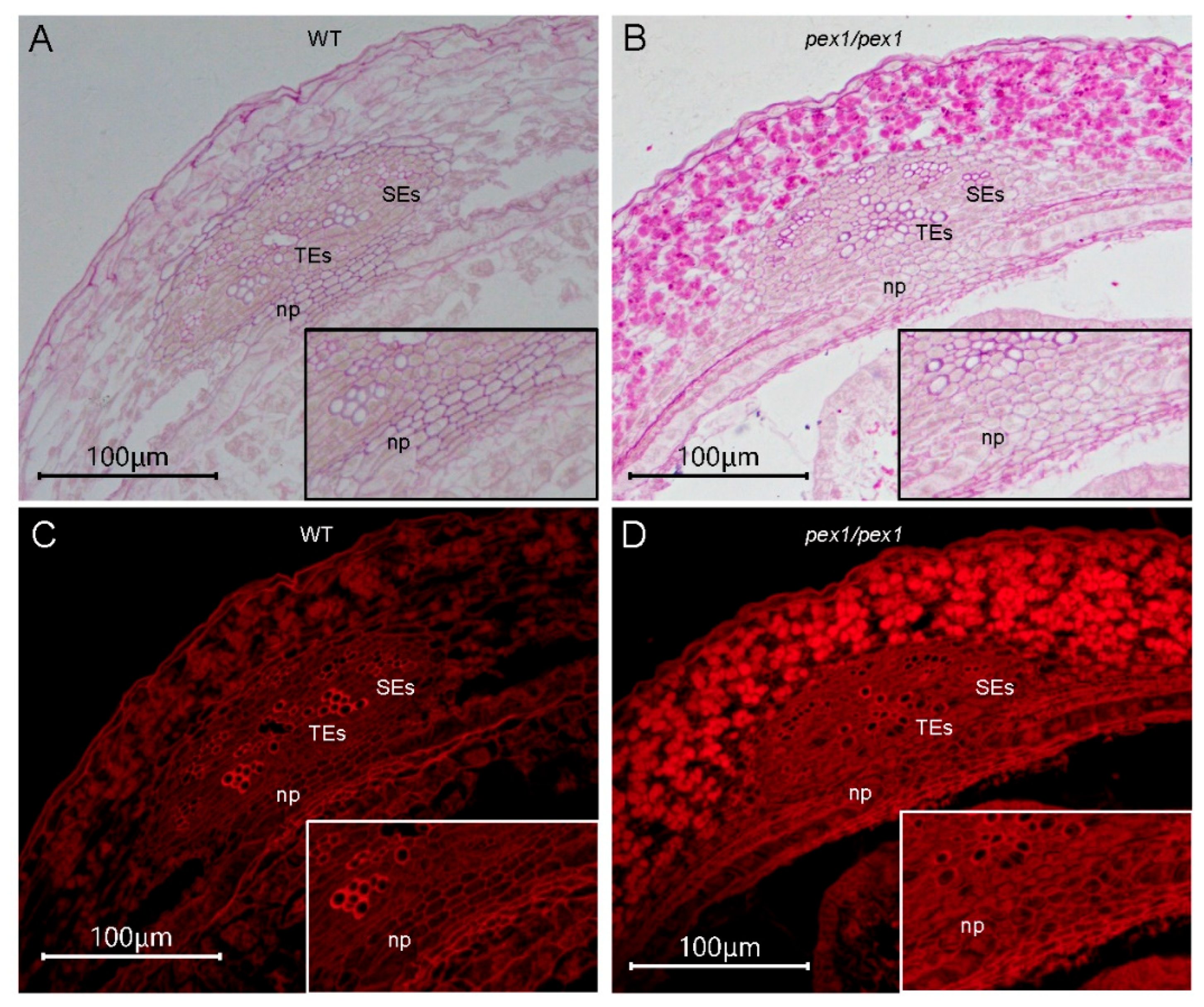 2.2. The pex1 Mutant Displayed Abnormal Starch Accumulation in the Pericarp